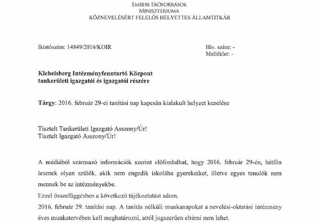 A közoktatásért felelős helyettes államtitkár, Sipos Imre levelet küldött minden iskolaigazgatónak, miszerint el ne felejtsék, hogy február 29-e – vagyis a ’Nem leszek suliban’ nevet viselő tüntetés napja - elvileg ugyanolyan tanítási napnak minősül, mint bármelyik másik. Ezt a kettős Mérce című blog írta.