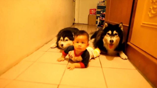Itt egy újabb utánzós videót láthatunk – két szibériai husky kutyus laposkúszásban követi a földön mászó kisbabát. Mintha csak két testőr követné a nagyfőnököt! Engem mindig képesek meglepni a kutyák, hogy mennyire okosak és ügyesek tudnak lenni! A picúr bár kapott egy kis előnyt, a verseny mégis nagyon szorossá válik! Vigyázz, kész, rajt!