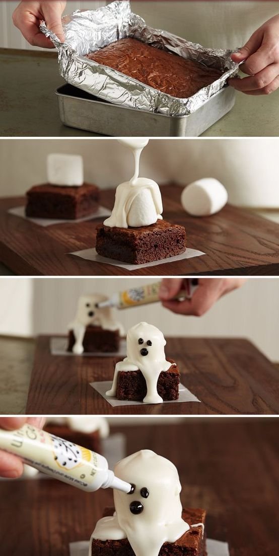 Süss egy adag csokis piskótát, majd vágd kisebb szeletekre. Ezután illessz a tetejére egy-egy mályvacukrot. Végezetül, önts le olvasztott, fehér csokival. A végeredmény nagyon szellemes lesz.