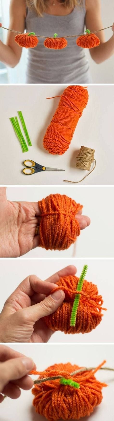 A narancsszínű fonalat tekerd a tenyered köré, a képen látható módon. Majd fűz a tetejére egy merev, zöld színű drótot. Ezek után nincs más dolgod, mint egy hosszú, barna fonalra fűzni őket. Remek dísze lehet az osztálytermeknek és óvodáknak.