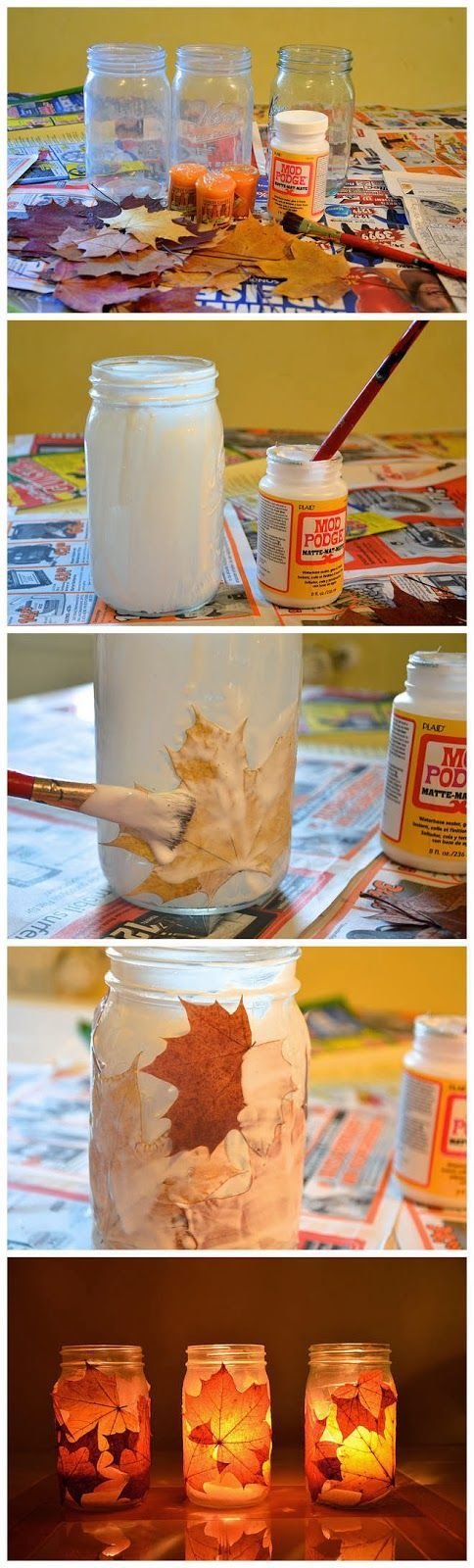 Nézzünk szét a spájzba van-e üres és letisztított befőttesüveg. Ha igen, tisztítsuk meg a portól. Kenjük be az egész felületét ragasztóval, majd ragasszunk rá, lehullott faleveleket. A levelek közt hagyjunk némi rést, hogy ha beletesszük a teamécsest, legyen rés, ahol kiszűrődhet a fény!