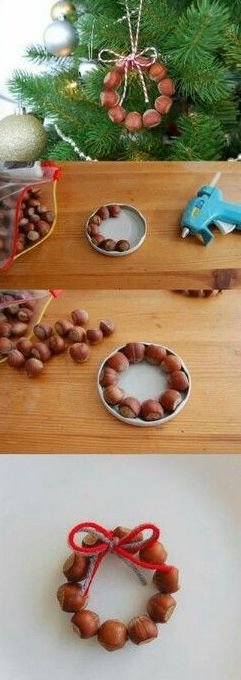 Keressük meg az előzőleg felhasznált befőttesüveg tetejét. Ez lesz a koszorúnk alapja. Ha megvagyunk, keressünk egy ragasztópisztolyt. Ragasztózzuk be a gesztenyéket, majd a képen látható módon, egymáshoz illesztjük. Hagyjuk egy éjszakát száradni, majd vegyük ki a sablonból, és kössük át egy színes szalaggal. Készen is vagyunk!