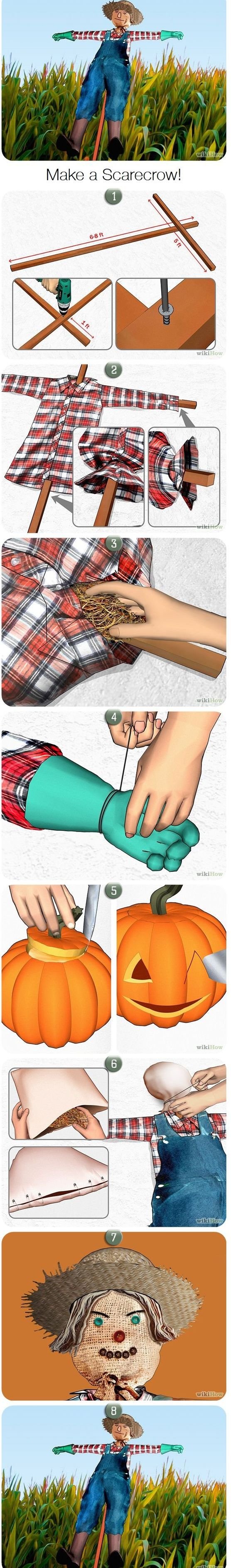 Először is készítsünk fa, keresztet a képen látható méretek segítségével. Keressünk a szekrényben egy régóta nem használt kockásinget. Húzzuk a keresztre. Az inget szalmával tömjük ki. Ezután gumikesztyűt varrunk az inghez, ez lesz a keze. A madárijesztő feje kétféle módon is elkészíthető. Az egyik, hogy egy tökből faragjuk ki. A másik, hogy egy zsákot tömünk ki, majd rajzolunk meg. Mindkettő nagyon rémisztő. Végezetül szalmakalapot teszünk rá.