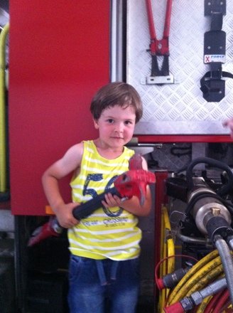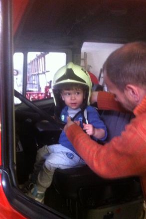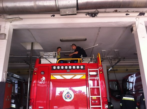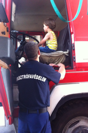 Amint beléptünk a már ismerős kapun, szembetaláltuk magunkat egy méretes tűzoltóautóval. Majd bekukkantva a szertárba még eggyel, meg még eggyel, és így tovább. Volt itt minden, ami csak egy kisfiúnak tetszhet: nem elég, hogy fel lehetett mászni az autókba, és egy pár perc erejéig igazi tűzoltónak képzelni magunkat (ugyanis nem egy szülő is megnézte, milyen fentről a „kilátás”), miközben kormányozza a böhöm nagy járművet, ráadásul még fel- és ki- is volt nyitogatva az autók oldala.